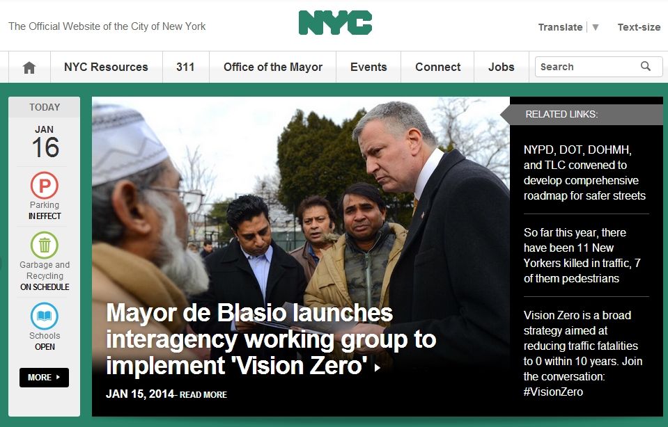 - Stephen Miller, “De Blasio Rolls Out a Multi-Agency Approach to Reducing Traffic Violence,” Streetsblog (January 15, 2014)